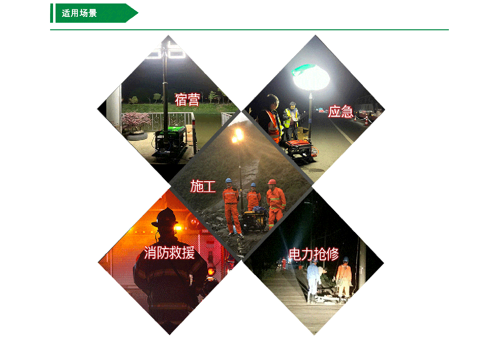 各種夜間作業(yè)如大型施工、工程搶修、災(zāi)情搶險(xiǎn)、消防照明、警案現(xiàn)場、交通拯救、事故處理和廣告拍攝等場合,滿足了現(xiàn)場對大面積、高亮度照明的需求。
